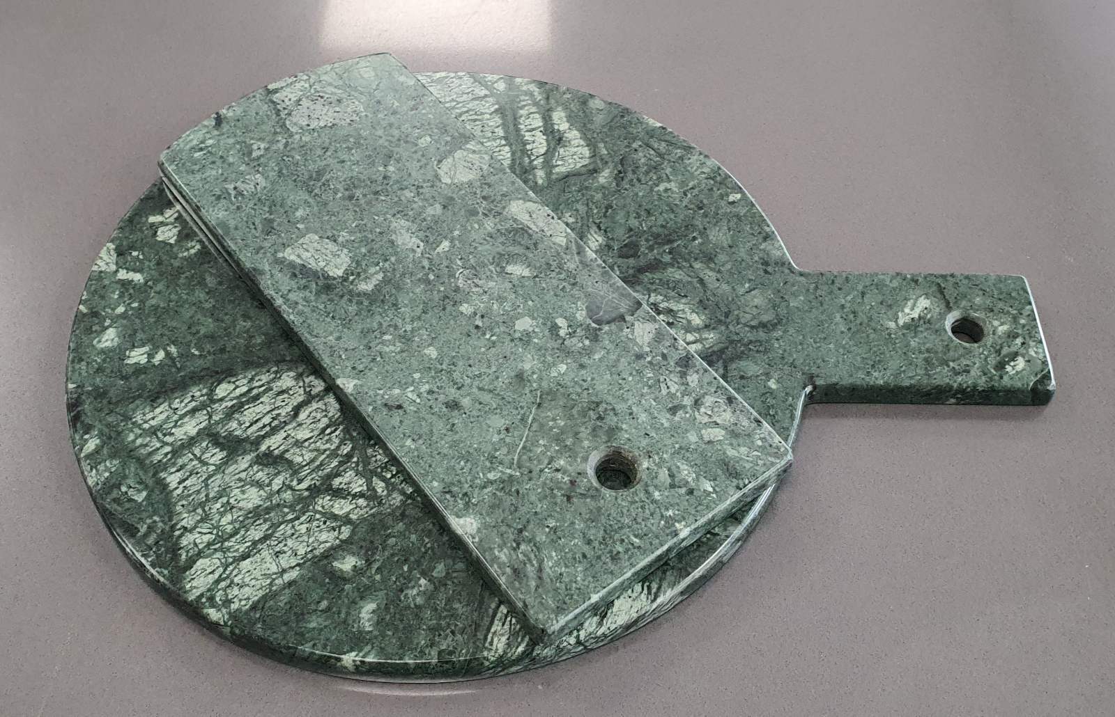 Στρογγυλός δίσκος σερβιρίσματος με λαβή για εύκολη και ασφαλή μεταφορά. Συνοδεύεται από μακρόστενο δίσκο για μια ολοκληρωμένη πρόταση. Διαθέτουν οπή και τα δύο.